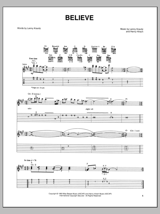 Download or print Lenny Kravitz Believe sheet music, chords and digital score arranged for Guitar Tab. This Pop score includes 4 page(s).