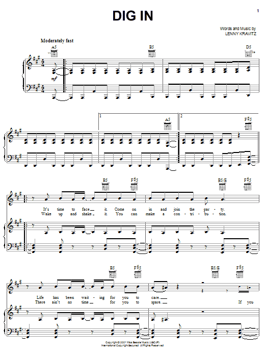Download or print Lenny Kravitz Dig In sheet music, chords and digital score arranged for Piano, Vocal & Guitar Chords (Right-Hand Melody). This Pop score includes 6 page(s).