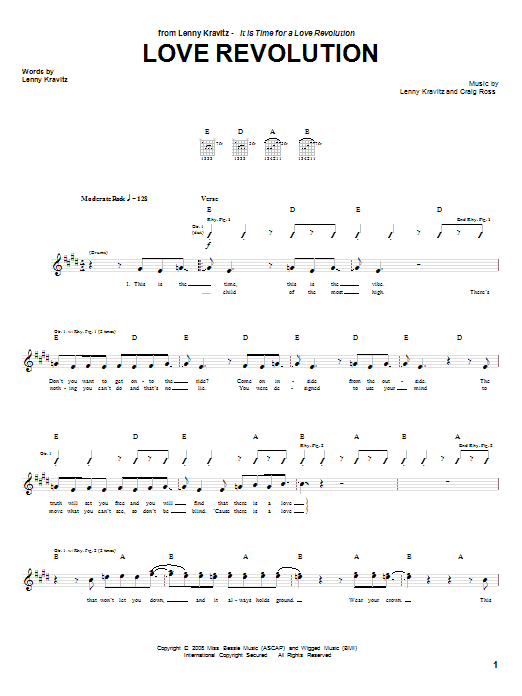 Download or print Lenny Kravitz Love Revolution sheet music, chords and digital score arranged for Guitar Tab. This Pop score includes 5 page(s).