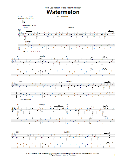 Download or print Leo Kottke Watermelon sheet music, chords and digital score arranged for Guitar Tab. This Country score includes 5 page(s).