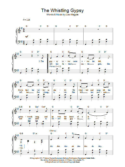 Download or print Leo Maguire Whistling Gypsy sheet music, chords and digital score arranged for Piano, Vocal & Guitar Chords. This Folk score includes 2 page(s).