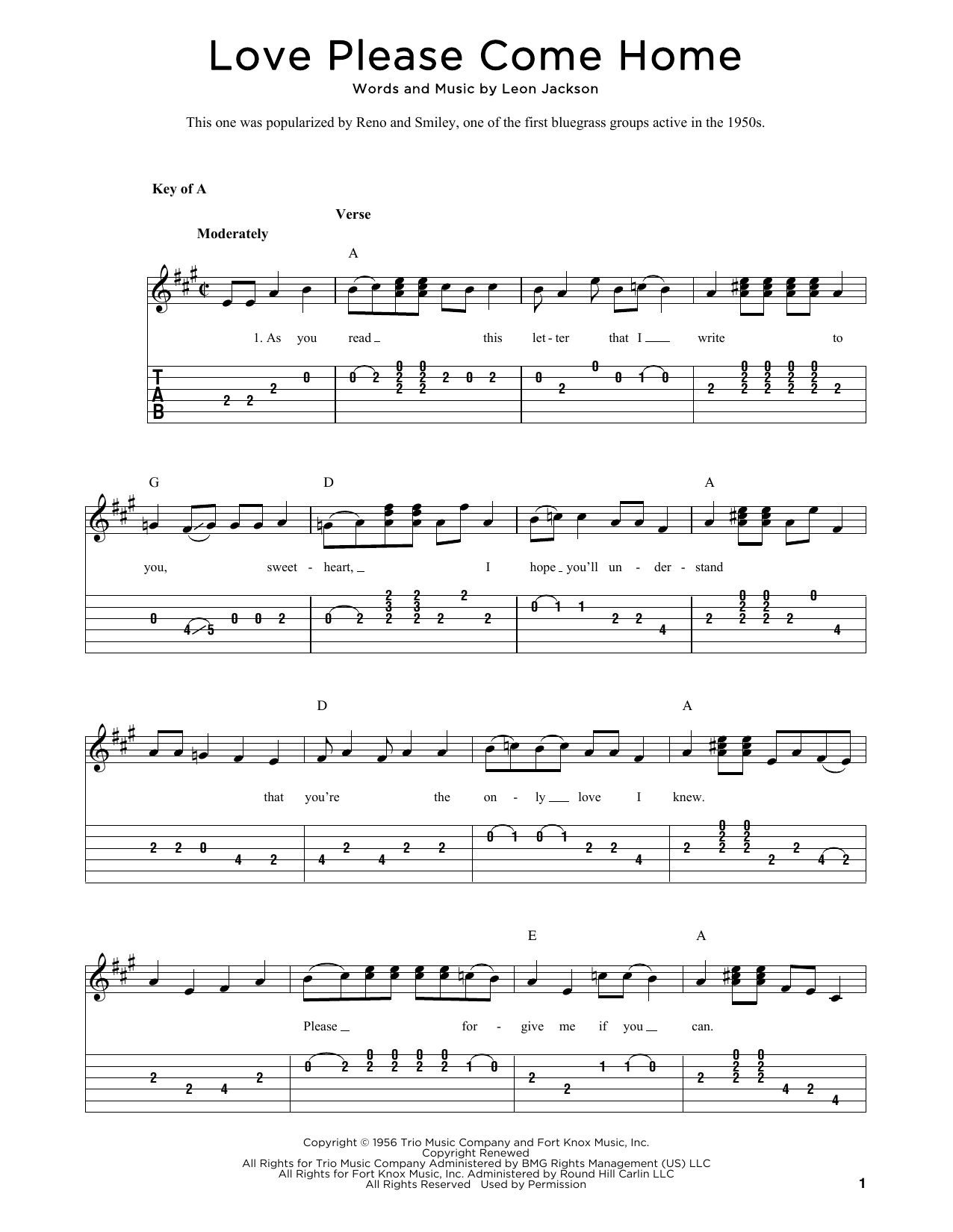 Download or print Leon Jackson Love Please Come Home (arr. Fred Sokolow) sheet music, chords and digital score arranged for Banjo Tab. This Country score includes 2 page(s).