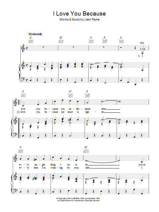 Download or print Leon Payne I Love You Because sheet music, chords and digital score arranged for Piano, Vocal & Guitar Chords (Right-Hand Melody). This Country score includes 3 page(s).
