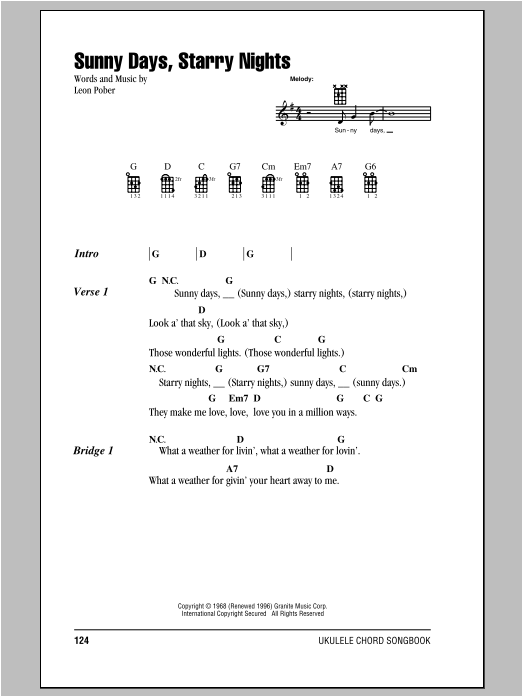 Download or print Leon Pober Sunny Days, Starry Nights sheet music, chords and digital score arranged for Piano, Vocal & Guitar Chords (Right-Hand Melody). This Folk score includes 3 page(s).