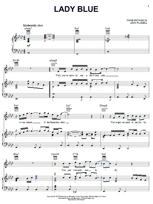 Download or print Leon Russell Lady Blue sheet music, chords and digital score arranged for Easy Piano. This Pop score includes 5 page(s).