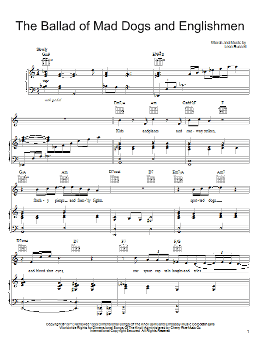 Download or print Leon Russell The Ballad Of Mad Dogs And Englishmen sheet music, chords and digital score arranged for Piano, Vocal & Guitar Chords (Right-Hand Melody). This Pop score includes 5 page(s).