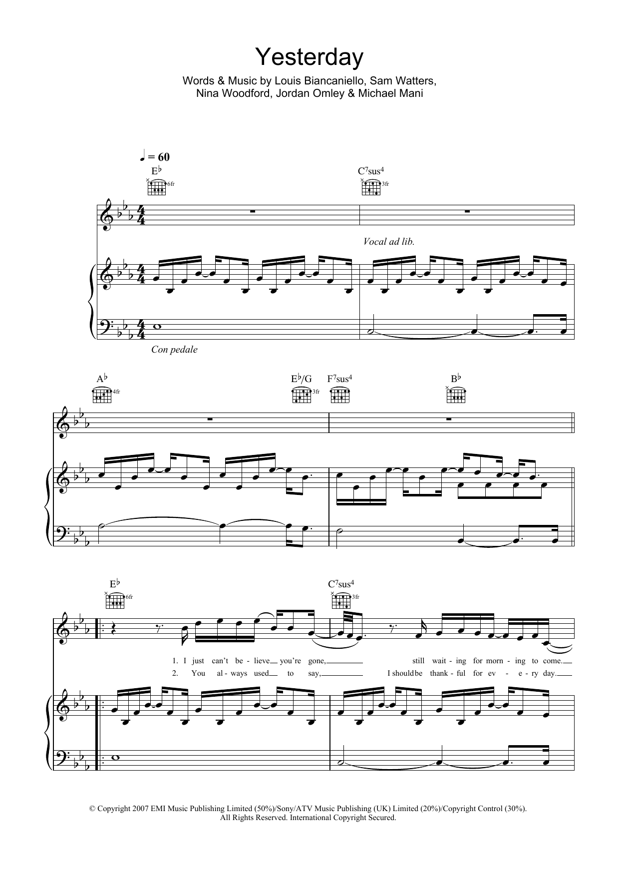 Download or print Leona Lewis Yesterday sheet music, chords and digital score arranged for Piano, Vocal & Guitar Chords (Right-Hand Melody). This Pop score includes 9 page(s).