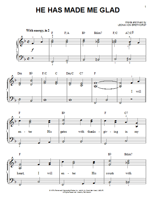 Download or print Leona Von Brethorst He Has Made Me Glad sheet music, chords and digital score arranged for Easy Piano. This Children score includes 3 page(s).