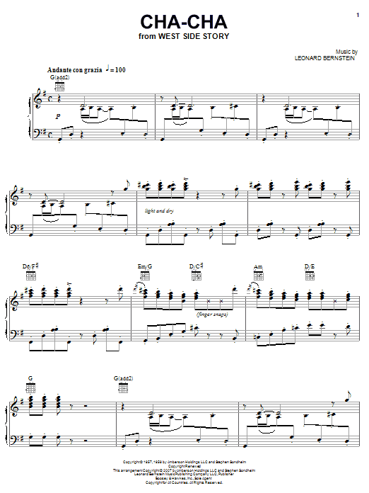 Download or print Leonard Bernstein Cha-Cha From The Dance At The Gym (from West Side Story) sheet music, chords and digital score arranged for Piano Solo. This Musical/Show score includes 2 page(s).