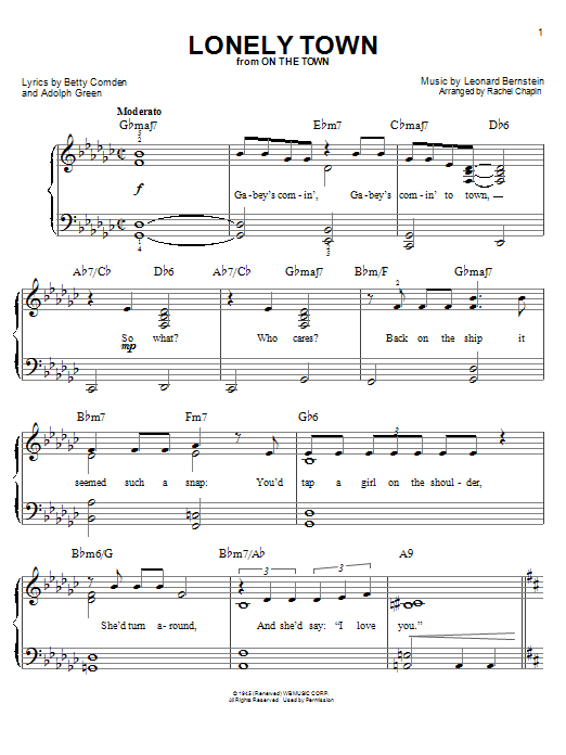 Download or print Leonard Bernstein Lonely Town (from On the Town) sheet music, chords and digital score arranged for Piano & Vocal. This Broadway score includes 5 page(s).