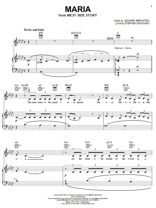 Download or print Leonard Bernstein Maria (from West Side Story) sheet music, chords and digital score arranged for Piano & Vocal. This Musical/Show score includes 7 page(s).