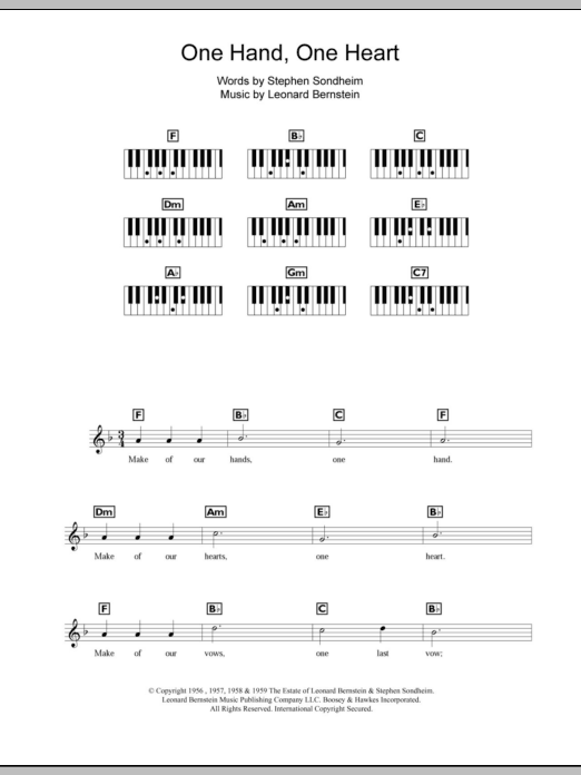 Download or print Leonard Bernstein One Hand, One Heart sheet music, chords and digital score arranged for Piano Chords/Lyrics. This Film/TV score includes 2 page(s).