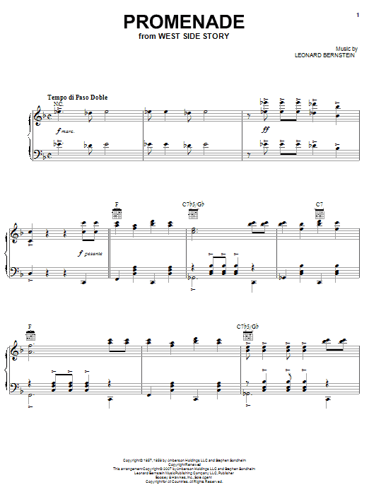 Download or print Leonard Bernstein Promenade From The Dance At The Gym (from West Side Story) sheet music, chords and digital score arranged for Piano Solo. This Musical/Show score includes 2 page(s).