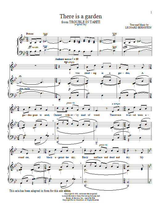 Download or print Leonard Bernstein There Is A Garden sheet music, chords and digital score arranged for Piano & Vocal. This Classical score includes 7 page(s).