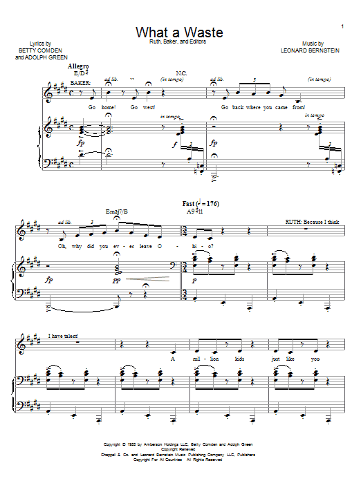 Download or print Leonard Bernstein What A Waste sheet music, chords and digital score arranged for Piano & Vocal. This Musical/Show score includes 8 page(s).