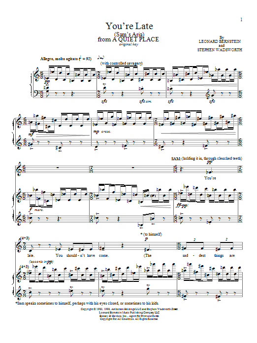 Download or print Leonard Bernstein You're Late (Sam's Aria) sheet music, chords and digital score arranged for Piano & Vocal. This Classical score includes 15 page(s).