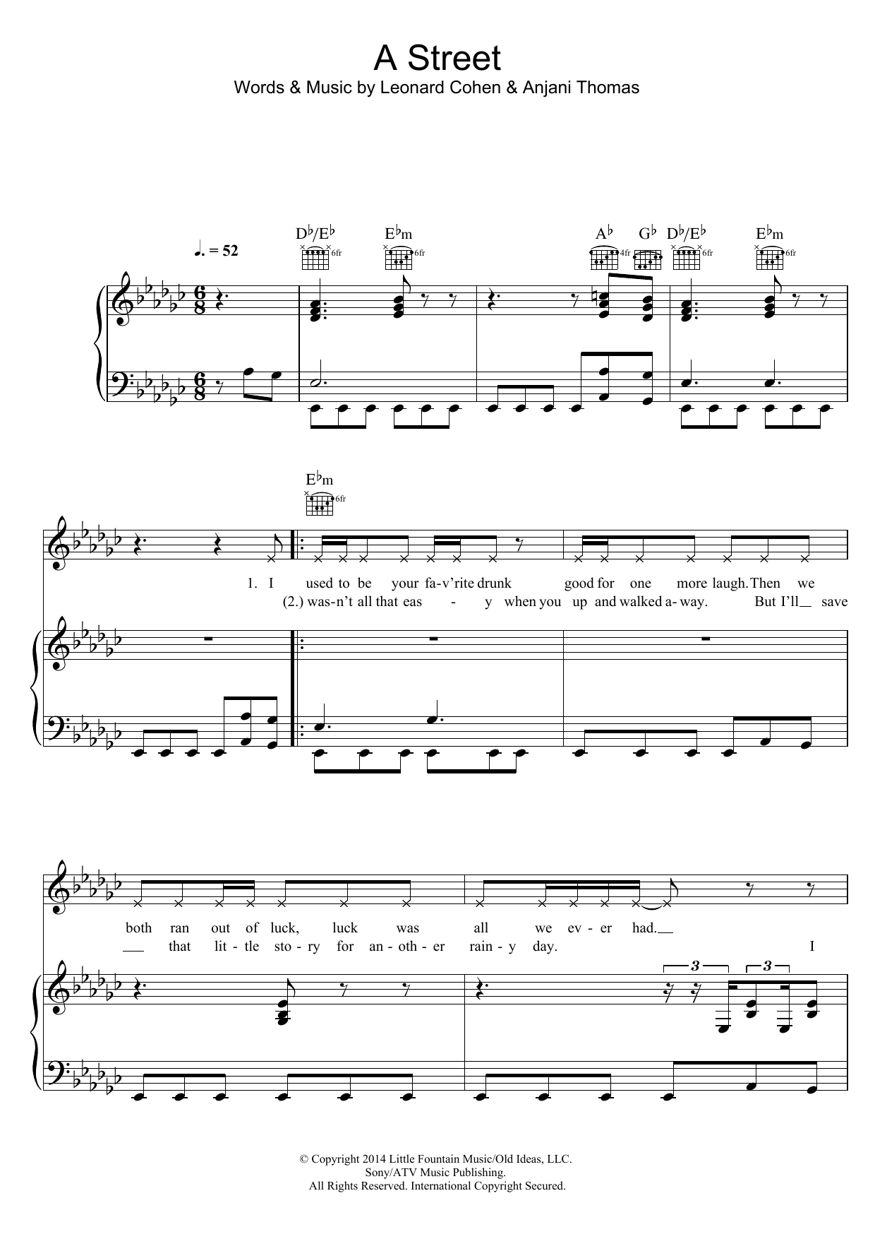 Download or print Leonard Cohen A Street sheet music, chords and digital score arranged for Piano, Vocal & Guitar Chords. This Folk score includes 4 page(s).