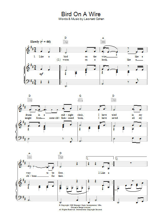 Download or print Leonard Cohen Bird On A Wire sheet music, chords and digital score arranged for Piano, Vocal & Guitar Chords. This Pop score includes 5 page(s).