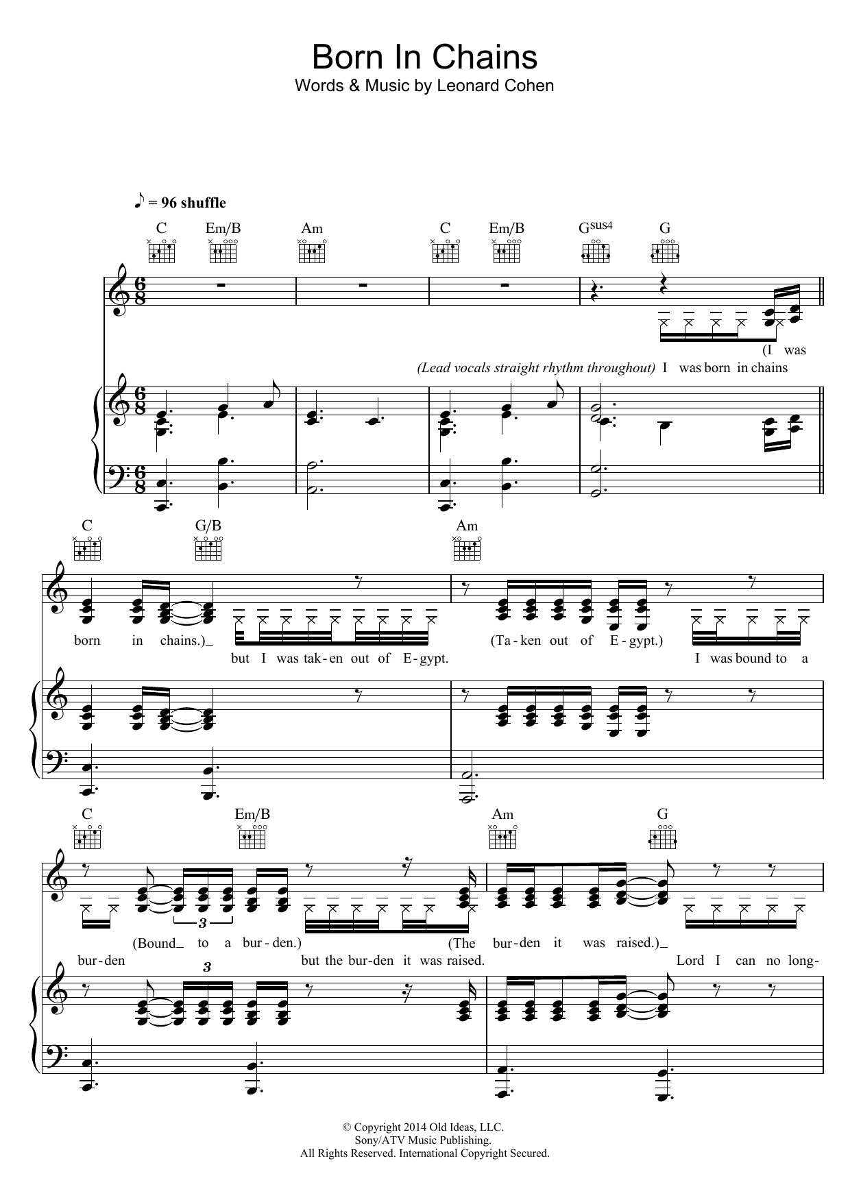 Download or print Leonard Cohen Born In Chains sheet music, chords and digital score arranged for Piano, Vocal & Guitar Chords. This Folk score includes 7 page(s).