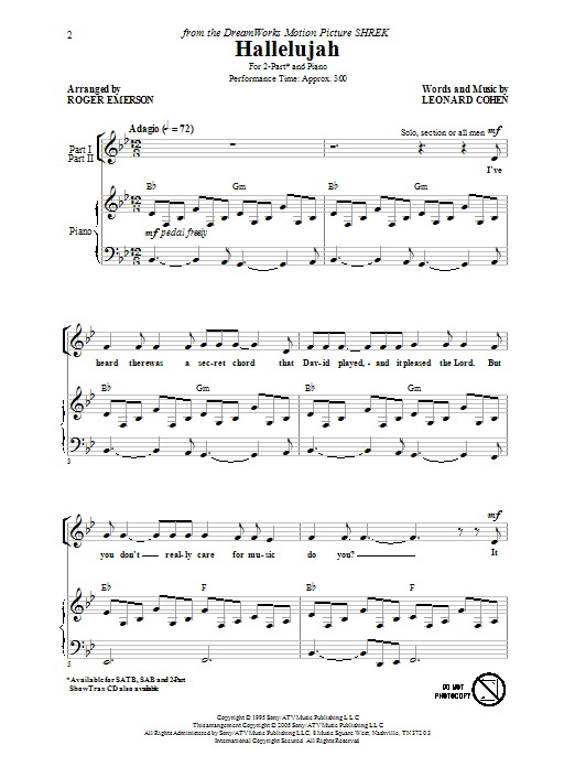 Download or print Leonard Cohen Hallelujah (arr. Roger Emerson) sheet music, chords and digital score arranged for SSA Choir. This Pop score includes 11 page(s).