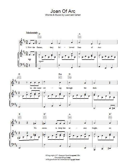 Download or print Leonard Cohen Joan Of Arc sheet music, chords and digital score arranged for Piano, Vocal & Guitar Chords. This Rock score includes 5 page(s).