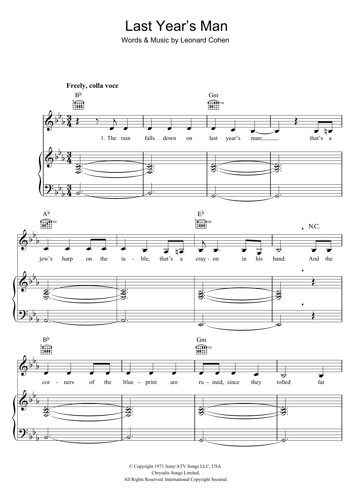 Download or print Leonard Cohen Last Year's Man sheet music, chords and digital score arranged for Guitar Chords/Lyrics. This Rock score includes 2 page(s).
