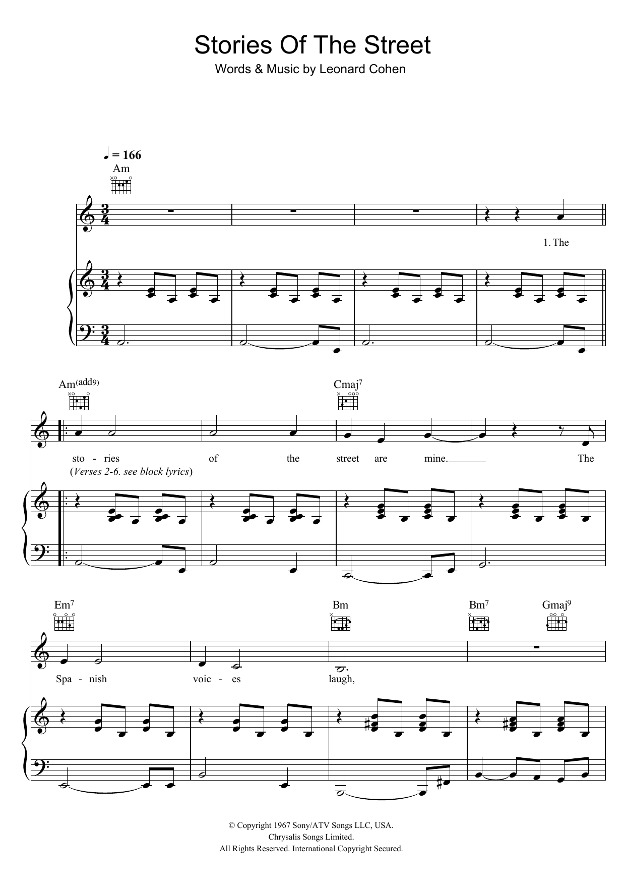 Download or print Leonard Cohen Stories Of The Street sheet music, chords and digital score arranged for Guitar Chords/Lyrics. This Rock score includes 3 page(s).