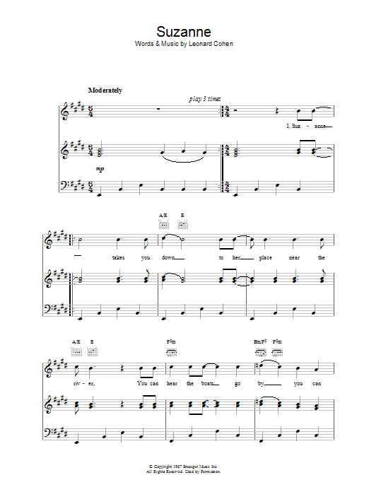 Download or print Leonard Cohen Suzanne sheet music, chords and digital score arranged for Solo Guitar. This Pop score includes 3 page(s).