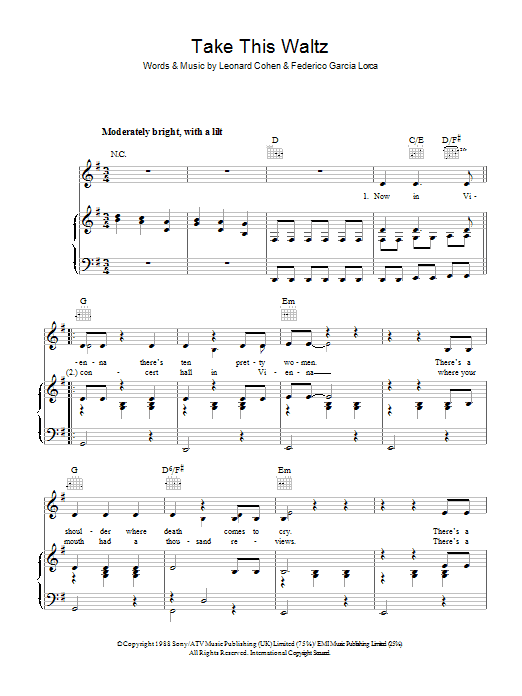 Download or print Leonard Cohen Take This Waltz sheet music, chords and digital score arranged for Guitar Chords/Lyrics. This Rock score includes 4 page(s).