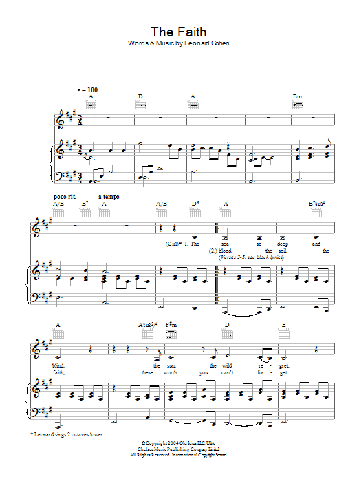 Download or print Leonard Cohen The Faith sheet music, chords and digital score arranged for Guitar Chords/Lyrics. This Rock score includes 2 page(s).