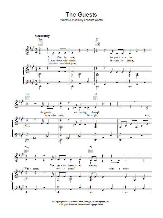Download or print Leonard Cohen The Guests sheet music, chords and digital score arranged for Guitar Chords/Lyrics. This Pop score includes 2 page(s).