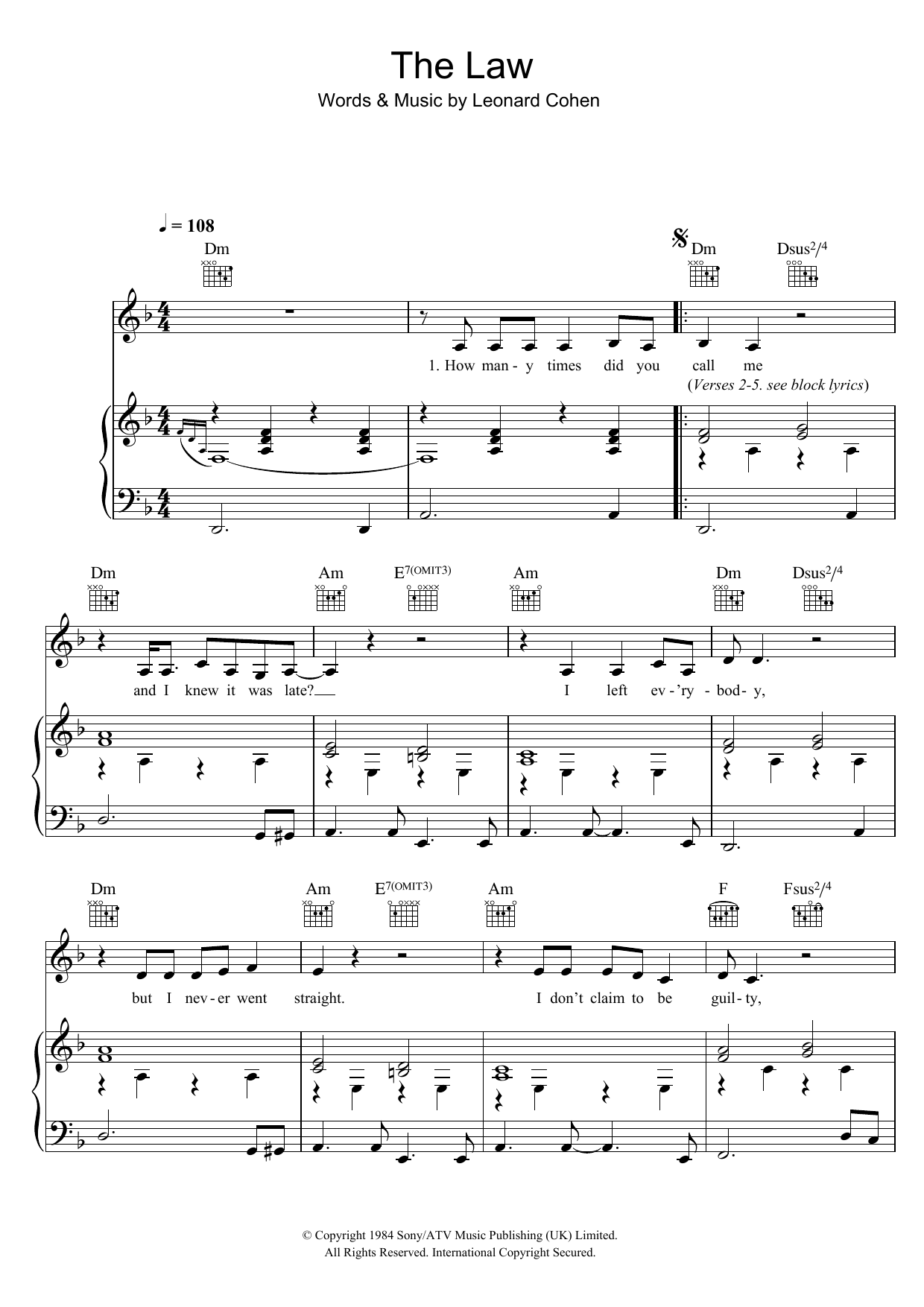 Download or print Leonard Cohen The Law sheet music, chords and digital score arranged for Guitar Chords/Lyrics. This Rock score includes 2 page(s).