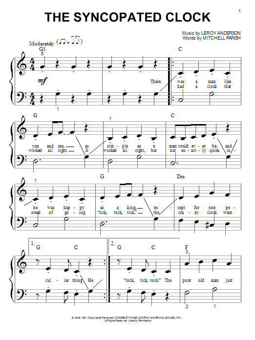 Download or print Leroy Anderson The Syncopated Clock sheet music, chords and digital score arranged for Easy Piano. This Children score includes 4 page(s).