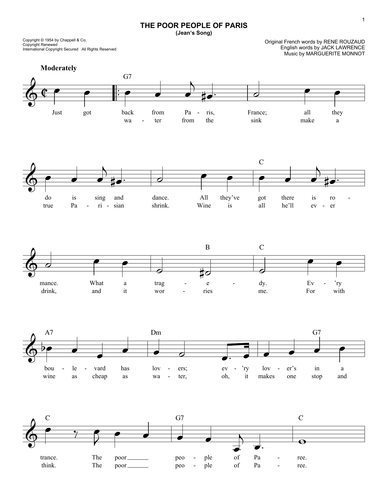 Download or print Les Baxter The Poor People Of Paris sheet music, chords and digital score arranged for Easy Lead Sheet / Fake Book. This Jazz score includes 2 page(s).