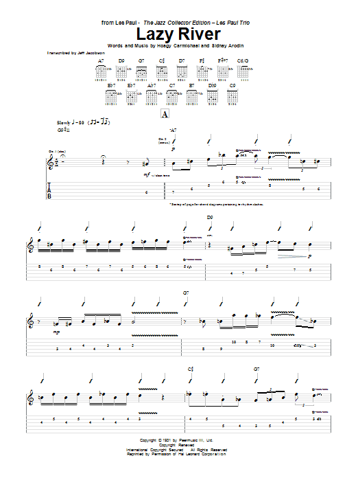 Download or print Les Paul Lazy River sheet music, chords and digital score arranged for Guitar Tab. This Jazz score includes 5 page(s).