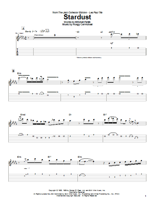 Download or print Les Paul Stardust sheet music, chords and digital score arranged for Guitar Tab. This Jazz score includes 3 page(s).
