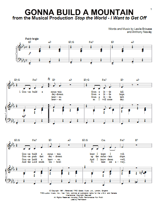 Download or print Leslie Bricusse Gonna Build A Mountain sheet music, chords and digital score arranged for Piano & Vocal. This Jazz score includes 5 page(s).