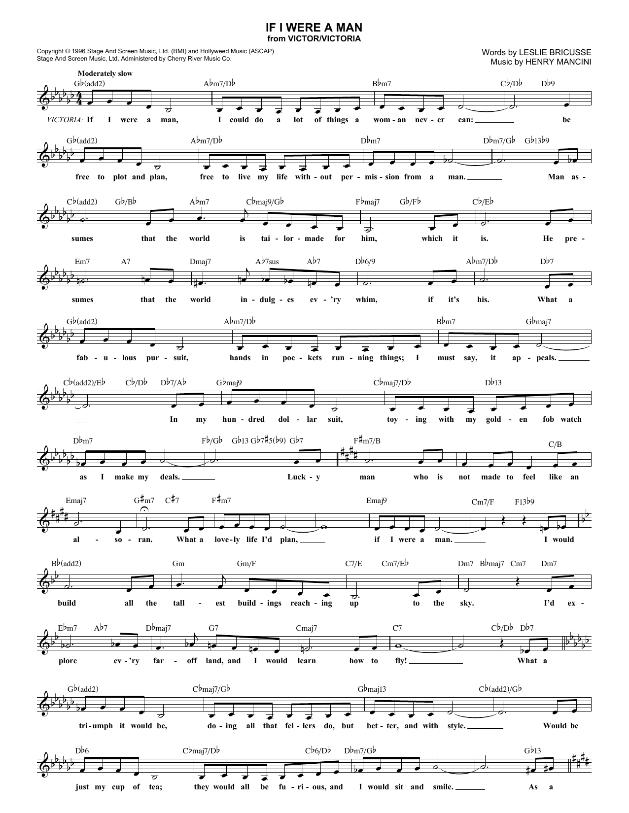 Download or print Leslie Bricusse If I Were A Man sheet music, chords and digital score arranged for Lead Sheet / Fake Book. This Musical/Show score includes 2 page(s).