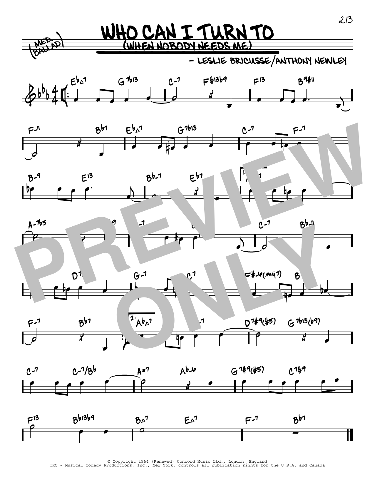 Download or print Leslie Bricusse Who Can I Turn To (When Nobody Needs Me) (arr. David Hazeltine) sheet music, chords and digital score arranged for Real Book – Enhanced Chords. This Jazz score includes 1 page(s).