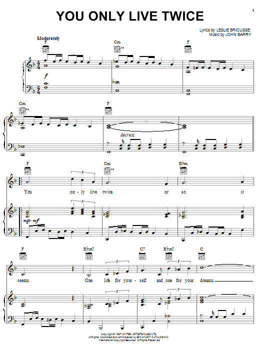 Download or print Leslie Bricusse You Only Live Twice sheet music, chords and digital score arranged for Really Easy Piano. This Jazz score includes 2 page(s).