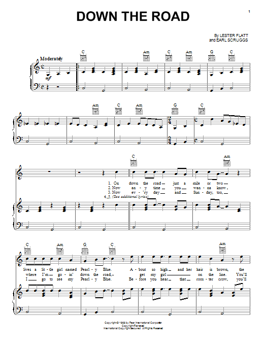Download or print Lester Flatt Down The Road sheet music, chords and digital score arranged for Piano, Vocal & Guitar Chords (Right-Hand Melody). This Folk score includes 2 page(s).
