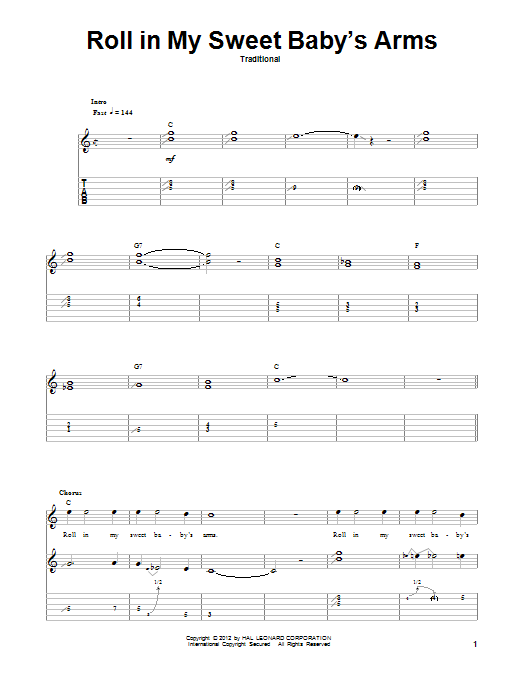 Download or print Lester Flatt Roll In My Sweet Baby's Arms sheet music, chords and digital score arranged for Guitar Tab (Single Guitar). This Country score includes 9 page(s).