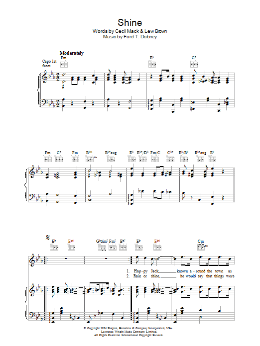 Download or print Lew Brown Shine sheet music, chords and digital score arranged for Piano, Vocal & Guitar Chords. This Pop score includes 5 page(s).