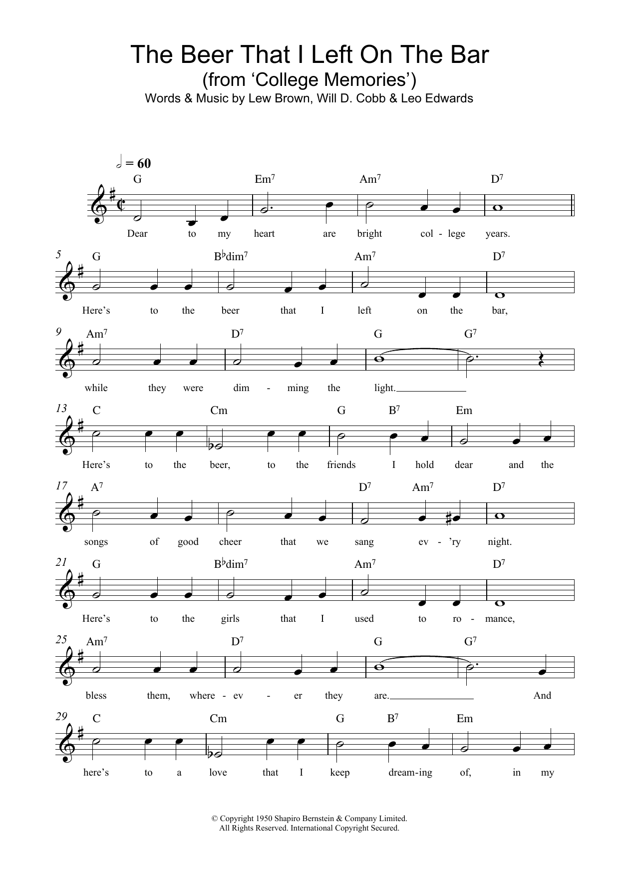 Download or print Lew Brown The Beer That I Left On The Bar (College Memories) sheet music, chords and digital score arranged for Lead Sheet / Fake Book. This Traditional score includes 2 page(s).