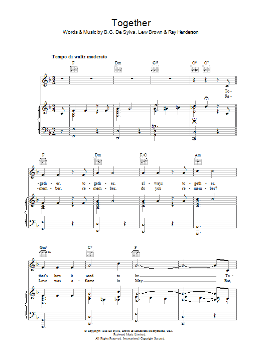Download or print Lew Brown Together sheet music, chords and digital score arranged for Piano, Vocal & Guitar Chords. This Pop score includes 4 page(s).