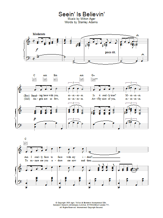 Download or print Lew Stone Seein' Is Believin' sheet music, chords and digital score arranged for Piano, Vocal & Guitar Chords. This Standards score includes 4 page(s).
