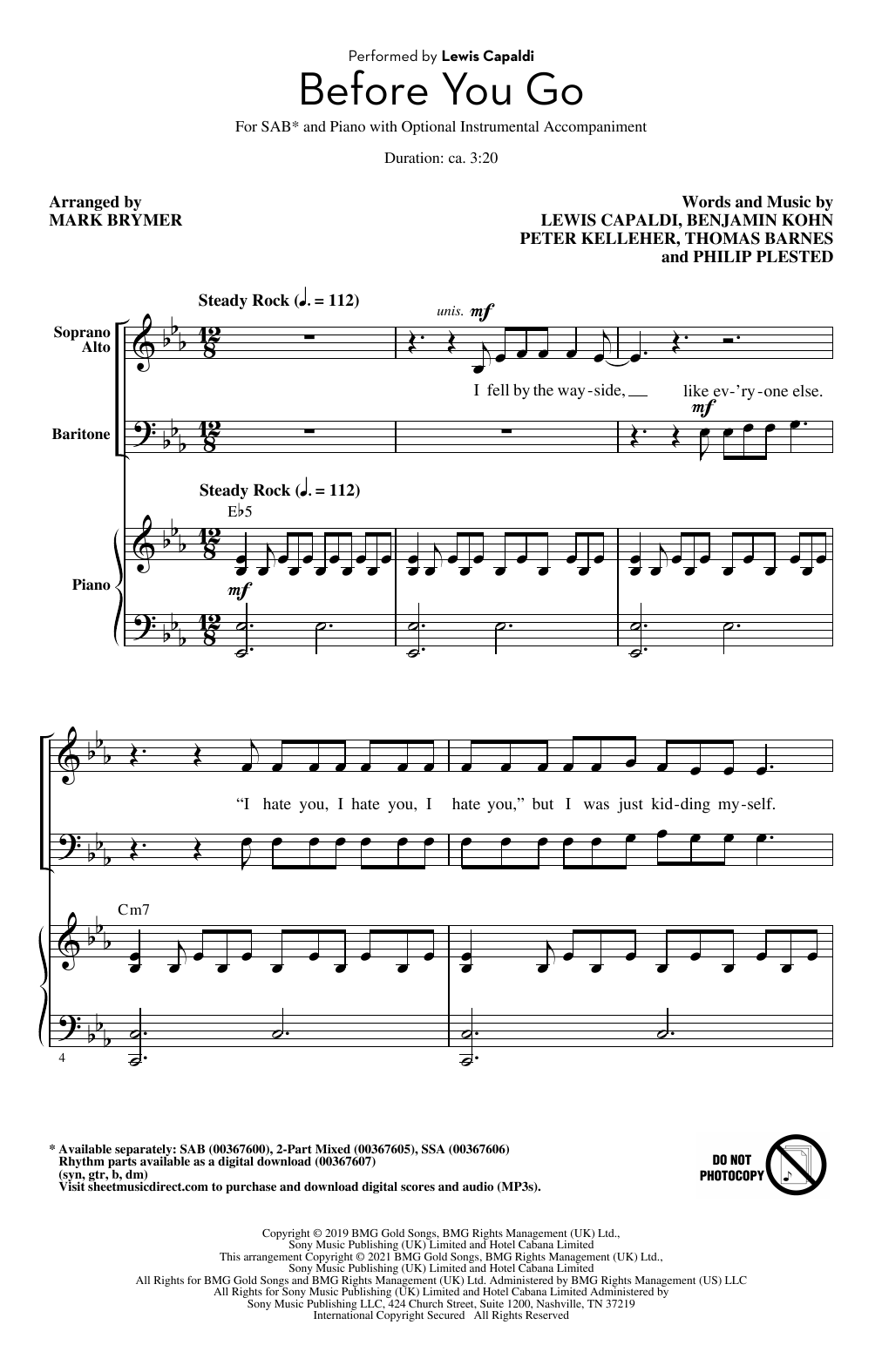 Download or print Lewis Capaldi Before You Go (arr. Mark Brymer) sheet music, chords and digital score arranged for SAB Choir. This Pop score includes 11 page(s).