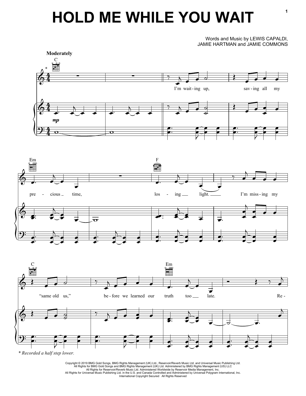 Download or print Lewis Capaldi Hold Me While You Wait sheet music, chords and digital score arranged for Piano, Vocal & Guitar Chords (Right-Hand Melody). This Pop score includes 7 page(s).