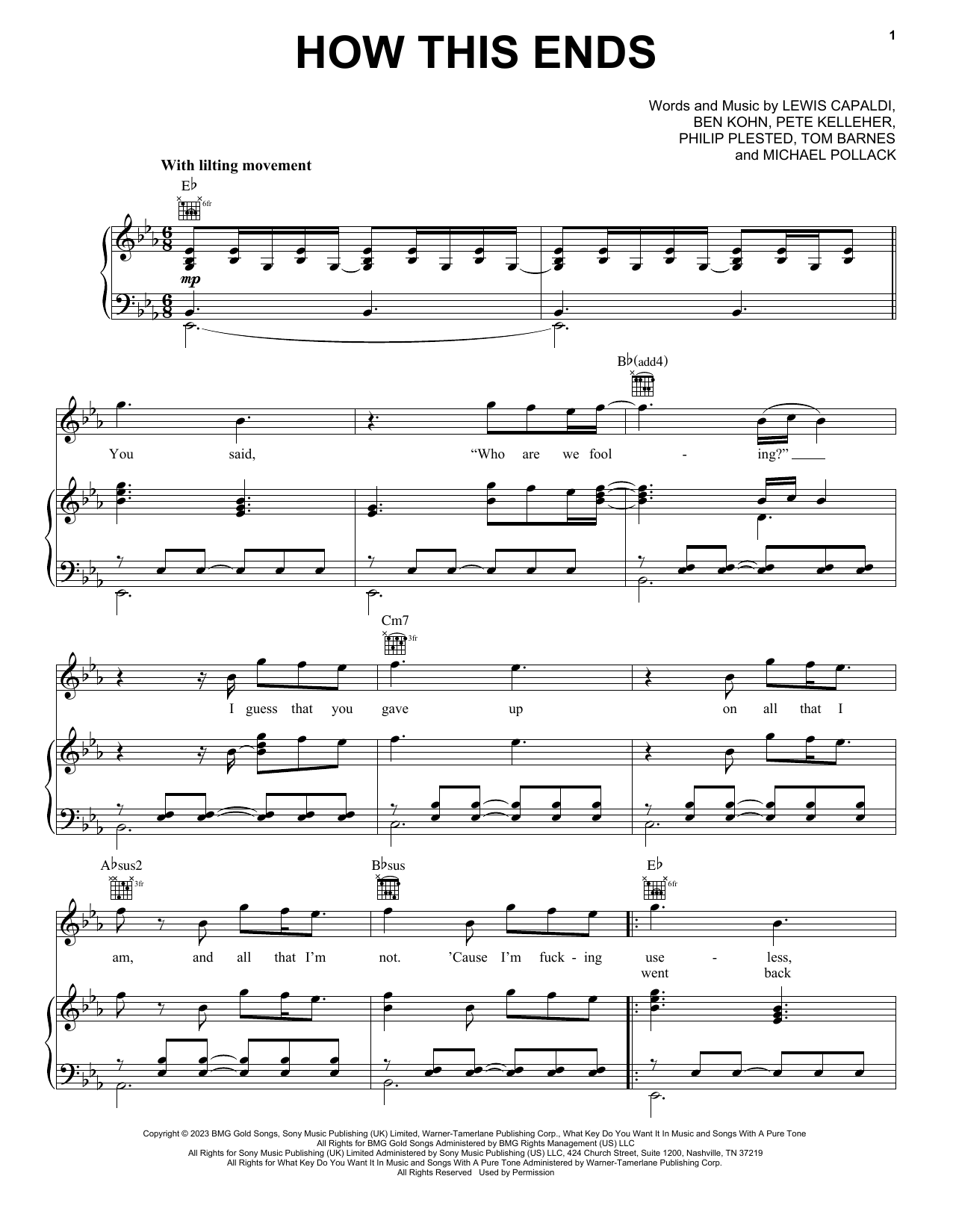 Download or print Lewis Capaldi How This Ends sheet music, chords and digital score arranged for Piano, Vocal & Guitar Chords (Right-Hand Melody). This Pop score includes 6 page(s).