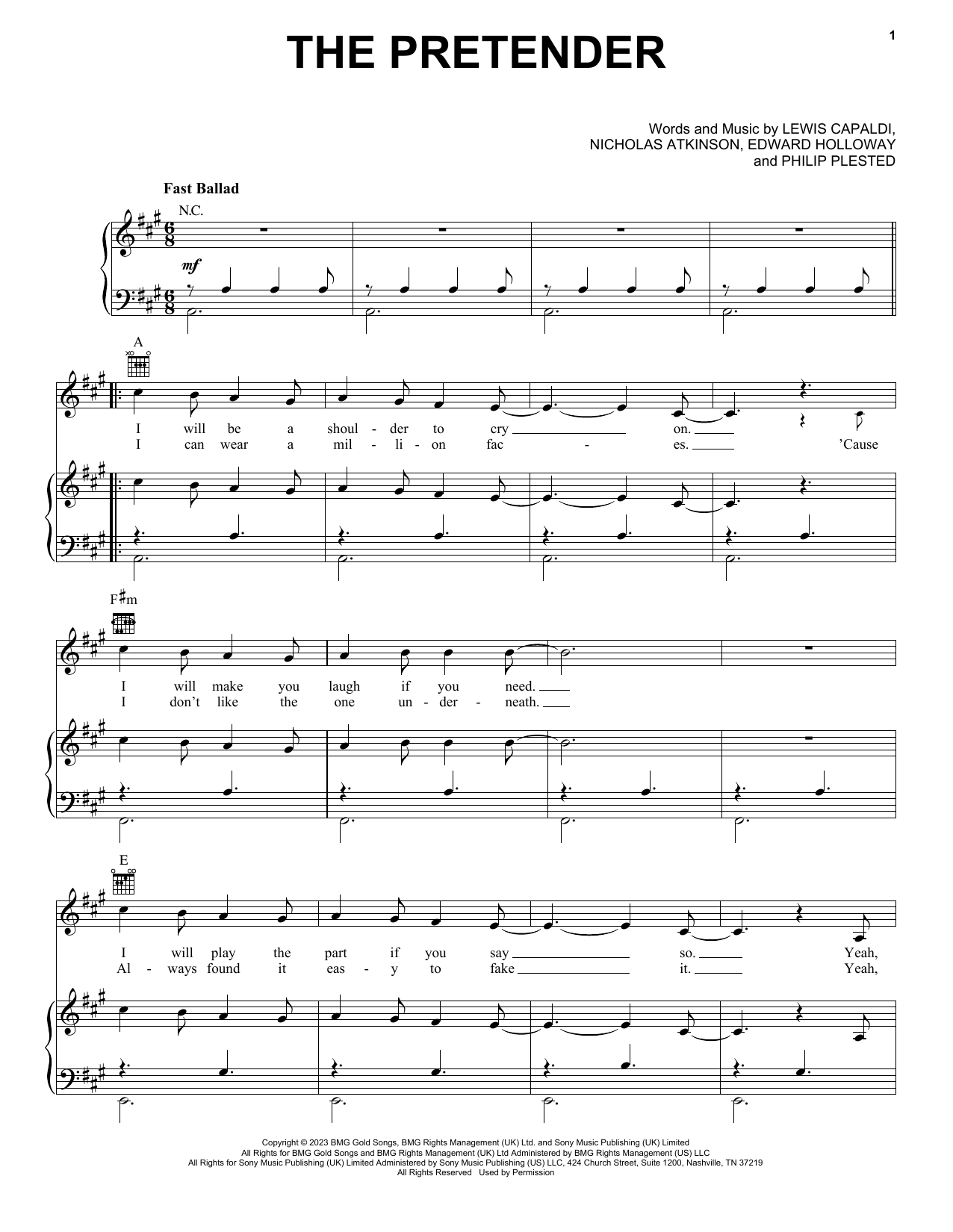Download or print Lewis Capaldi The Pretender sheet music, chords and digital score arranged for Piano, Vocal & Guitar Chords (Right-Hand Melody). This Pop score includes 8 page(s).
